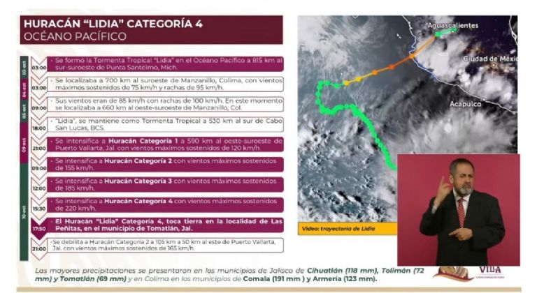 “El día de ayer, martes 10 de octubre, el huracán «Lidia», categoría 4 tocó tierra en la localidad de Las Peñitas, en el municipio de Tomatlán, Jalisco. Dos horas después se debilita a huracán categoría 2 al este de Puerto Vallarta. Los municipios en donde se registró la mayor precipitación en Jalisco fueron Cihuatlán, Tolima, Tomatlán y Autlán. Asimismo en Colima, en los municipios de Comala y Armería”, dijo la coordinadora nacional de Protección Civil.