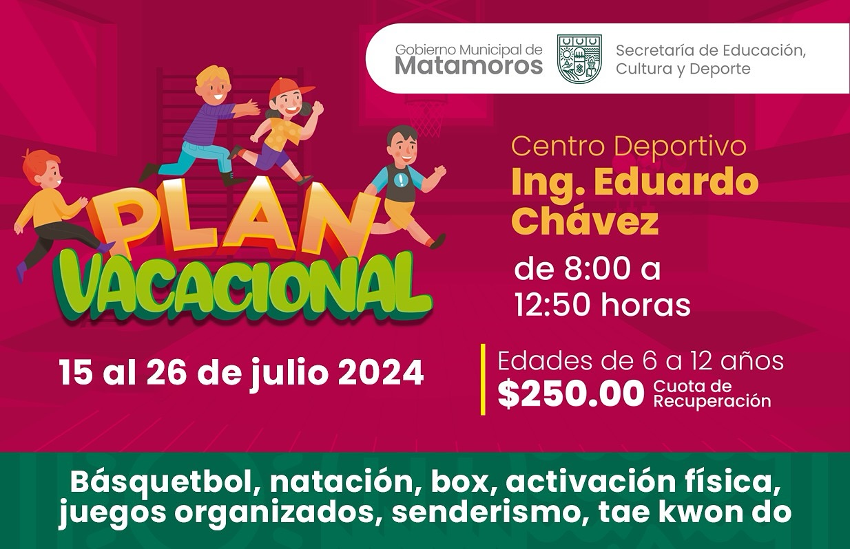 El Gobierno de Matamoros a través de la Secretaría de Educación, Cultura y Deporte invita al Plan Vacacional a realizarse del 15 al 26 de julio en el Deportivo «Ing. Eduardo Chávez».