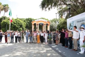 El alcalde Mario Alberto López Hernández acompañado de representantes de diferentes Logias masónicas; de autoridades educativas, civiles y militares, en la conmemoración del CXLVII aniversario luctuoso de Don Benito Juárez García.