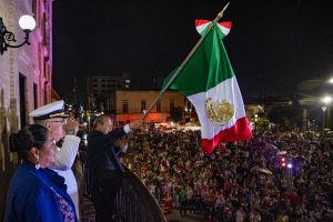 El Alcalde fue acompañado por su esposa Dolores Yañez, así como también por autoridades militares, quienes previo al tradicional Grito participaron en la ceremonia protocolaria de entrega de Bandera en la sala Benito Juárez.