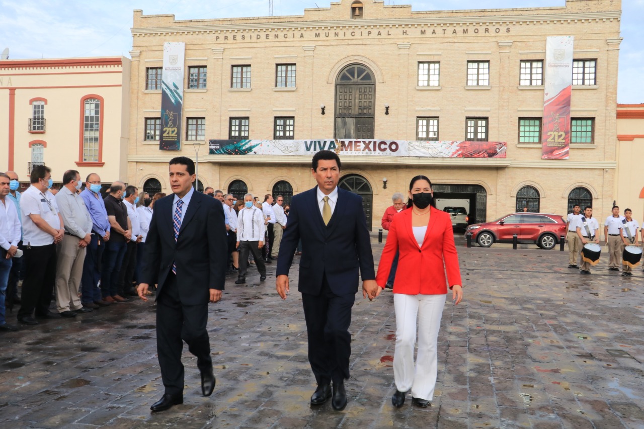 En este acto cívico del mes patrio, cuya organización correspondió a la Secretaría de Educación, Cultura y Deporte, el Presidente Municipal fue acompañado por: Marsella Huerta de López, Presidenta del DIF; por el Contralmirante Cuerpo General Diplomado de Estado Mayor, Luis Lázaro Cornejo Olivares, Comandante de la Primera Zona Naval y por el General Brigadier Diplomado de Estado Mayor, Julio César Islas Sánchez, Comandante de la Guarnición Militar de Matamoros.