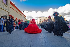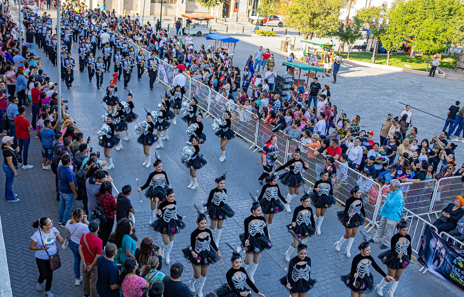 Instituciones de educación medio superior y superior desfilaron sobre el primer cuadro de la ciudad, mostrando trajes y bailes tradicionales de la festividad de Día de Muertos.