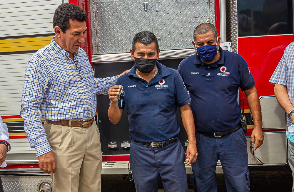 El alcalde Mario Alberto López Hernández entregó al heroico cuerpo de Bomberos una unidad equipada con bomba de agua, dos quijadas de la vida, así como otros instrumentos que vienen a fortalecer el equipamiento de la corporación, en beneficio de la población que requiera auxilio.