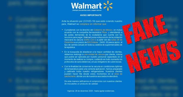 Walmart de México y Centroamérica desmintió una noticia falsa sobre la supuesta distribución y venta de la vacuna de COVID-19 en sus unidades en México, la cual se ha hecho viral en redes sociales.