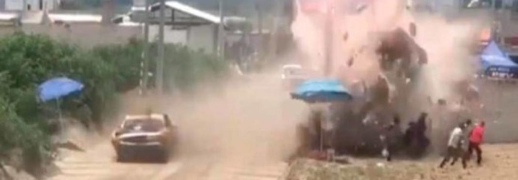 En el video se observa cómo el auto derribó la barda, levantó una gran nube de tierra y terminó por caer sobre los asistentes que presenciaban el espectáculo.