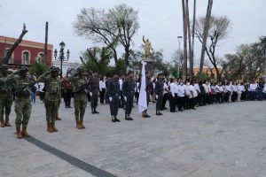Los empleados de las diferentes dependencias públicas se dieron cita a temprana hora en la plaza principal “Miguel Hidalgo” para participar en la ceremonia, cuya organización en este mes correspondió a la Secretaría de Desarrollo y Bienestar Social, en coordinación con la Secretaría de Educación, Cultura y Deporte.