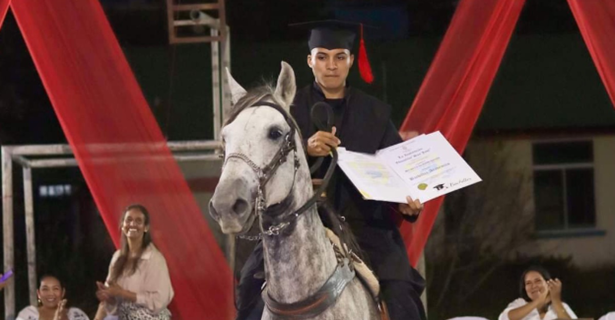 Imer Baldovino Queveda, un joven de Sucre, Bolivia, quien asistió a su ceremonia de graduación junto a su caballo Tormento, su compañero fiel de tantas caminatas hacia su escuela, la Institución Educativa San José de Majagual.