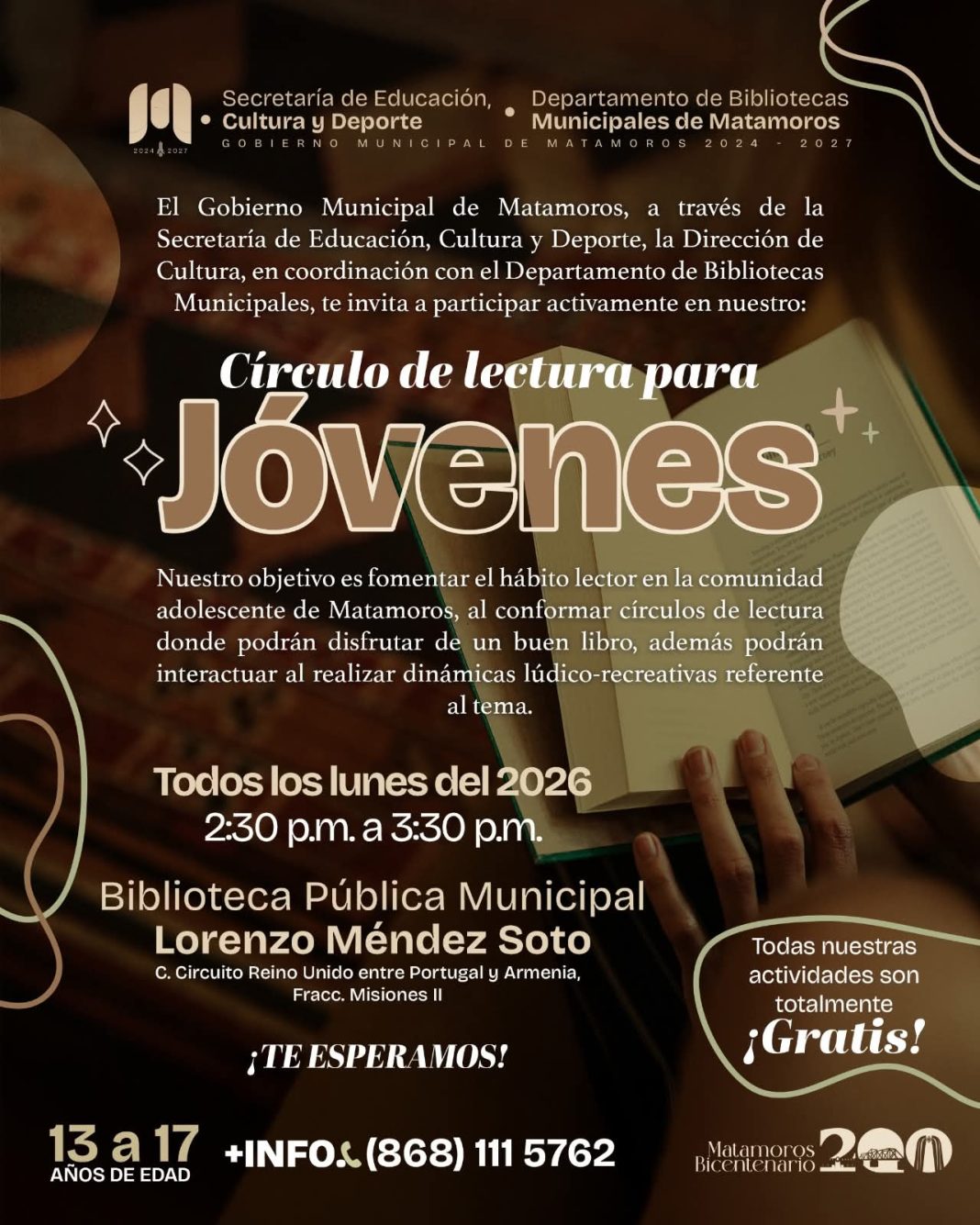 El Gobierno de Beto Granados, a través de la Secretaría de Educación, Cultura y Deporte, la Dirección de Cultura y en coordinación con el Departamento de Bibliotecas Municipales, impulsa el Círculo de Lectura para Jóvenes, un programa enfocado en fomentar el hábito lector entre la comunidad adolescente de Matamoros.