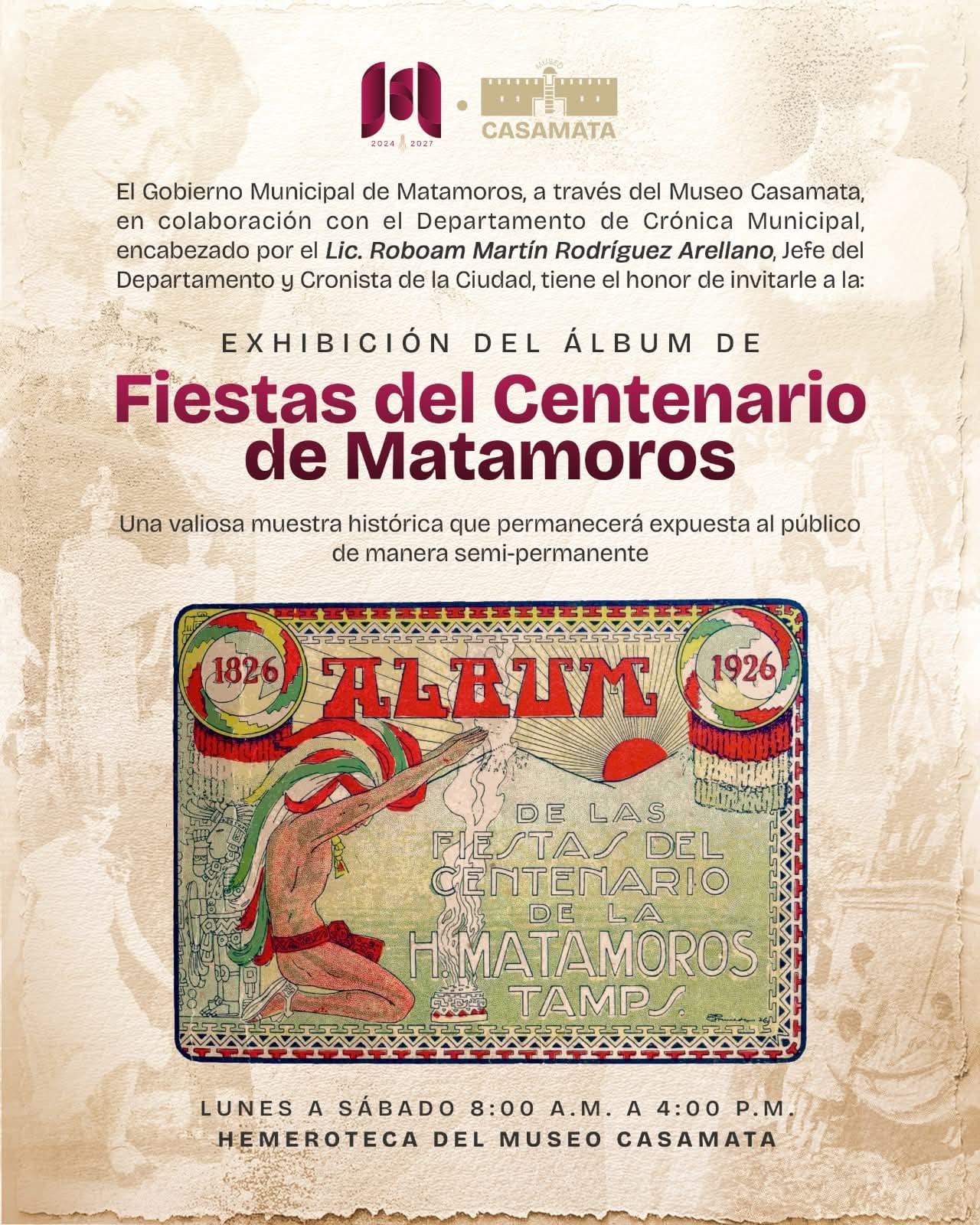 El Gobierno de Beto Granados informó que el Museo Casamata presenta la Exhibición del Álbum de Fiestas del Centenario de Matamoros, una valiosa muestra histórica que permite a la comunidad conocer y revivir momentos significativos de la ciudad.