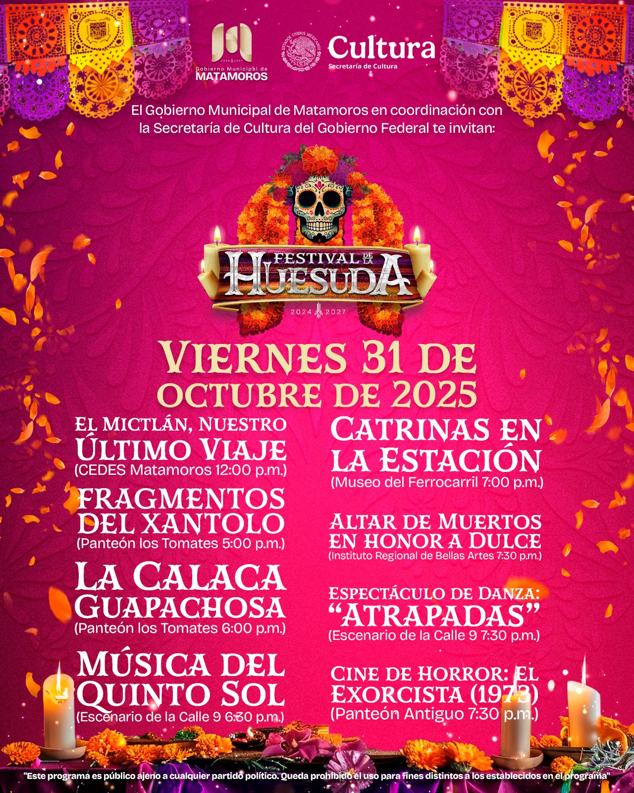 Durante esta jornada, Matamoros se viste de color y vida con recorridos, presentaciones de danza, música, proyecciones de cine y ofrendas, que rinden homenaje a nuestras raíces y a las tradiciones que dan identidad a México.