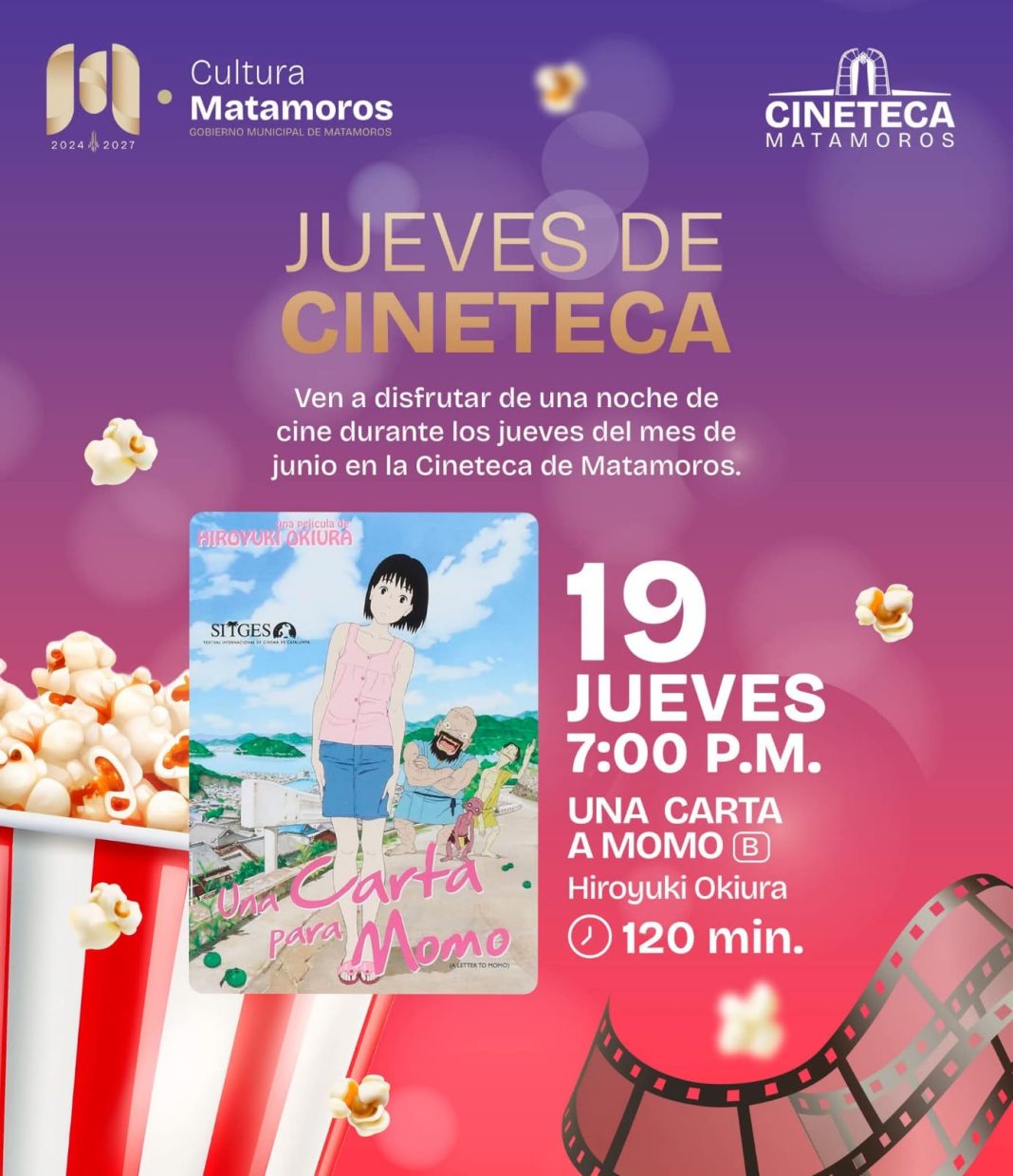 El Gobierno de Matamoros, que preside Beto Granados, invita a la comunidad a disfrutar de la película de animación japonesa «Una carta a Momo», dirigida por Hiroyuki Okiura. La proyección tendrá lugar mañana jueves 19 de junio a las 19:00 horas en la Cineteca Matamoros.