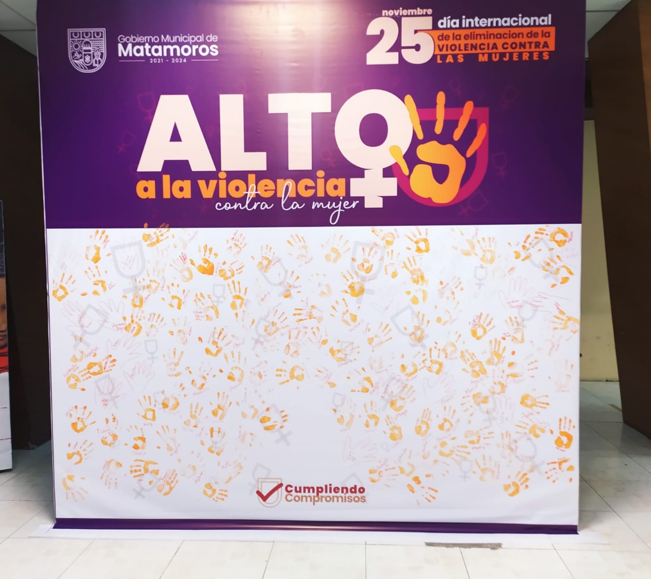 Sámano Saldívar informó que el pasado 25 de noviembre se realizó una actividad en el lobby de Palacio Municipal que consistió en plasmar las manos de los servidores públicos en una mampara, como símbolo de unión a la citada campaña.