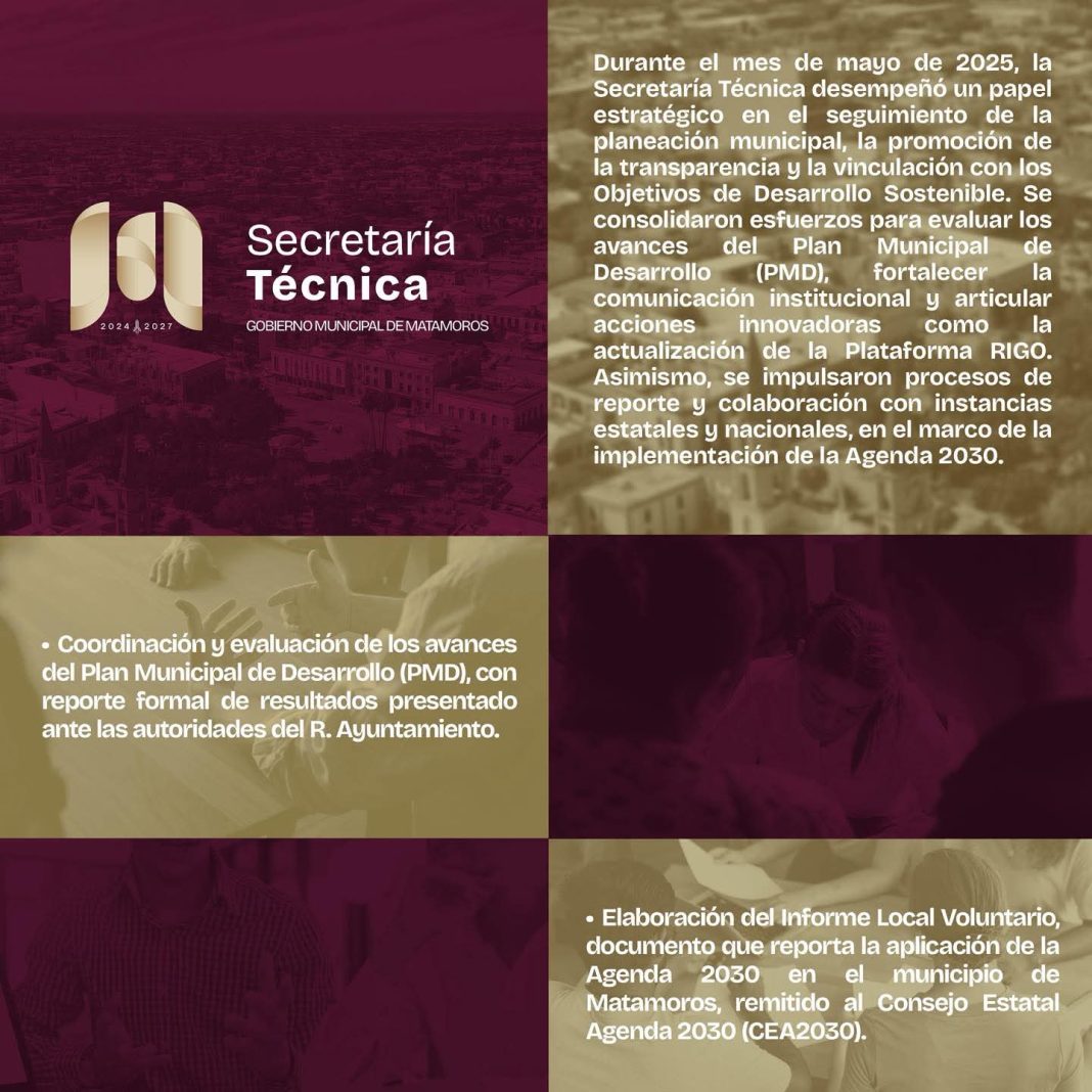 Durante el mes de mayo, el Gobierno Municipal de Matamoros, encabezado por Beto Granados, reafirmó su compromiso con la transparencia y la eficiencia administrativa, mediante el trabajo coordinado de la Secretaría Técnica. Estas acciones forman parte del esfuerzo constante por impulsar el Renacimiento de Matamoros y consolidar el desarrollo sostenible en la región.