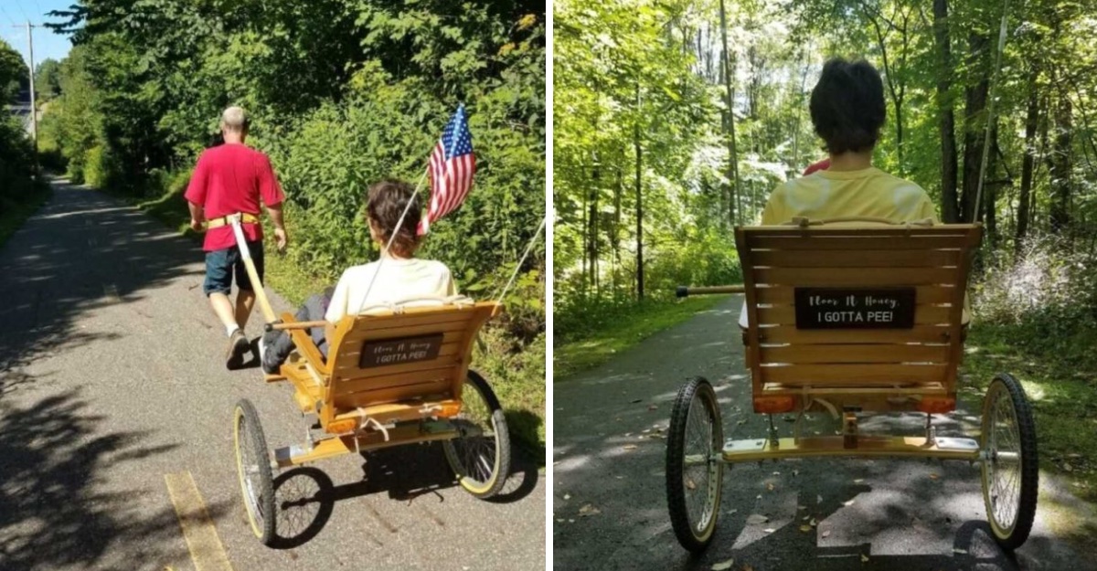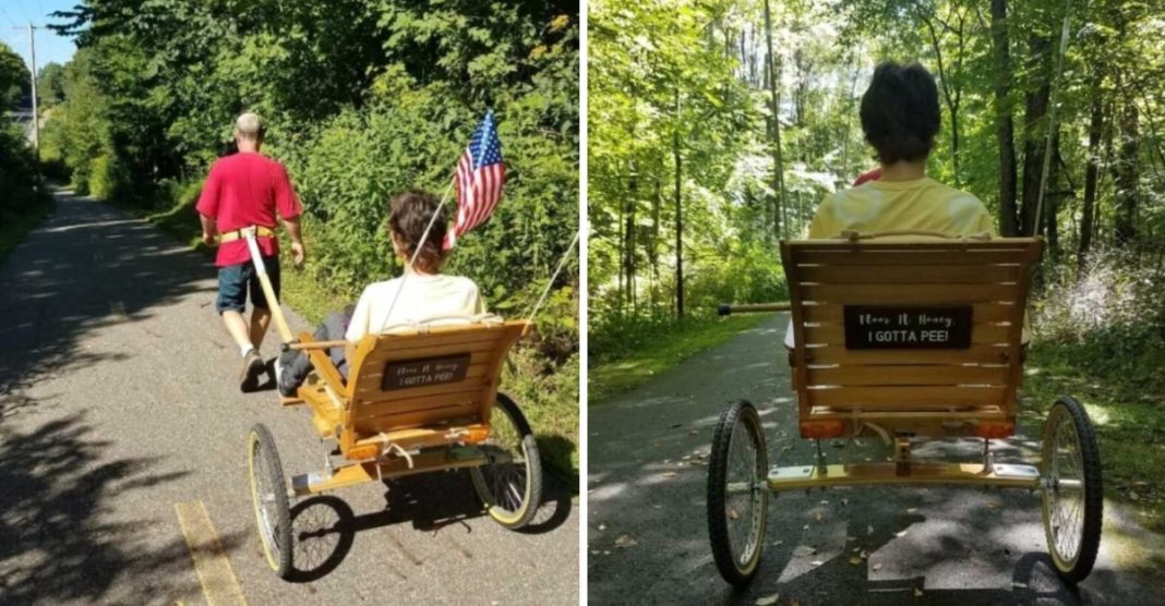 Rick construyó un carrito con ruedas, similar a un bicitaxi, para llevar a su esposa en cada uno de sus paseos. Y el sistema es simple, el carrito cuenta con dos ruedas y una estructura que puede amarrarse a la cintura de Rick, para que éste empuje el vehículo con su propio cuerpo.