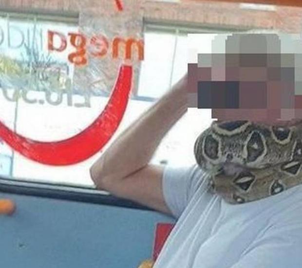 Un hombre fue grabado usando el transporte público mientras usaba una serpiente viva como cubrebocas.