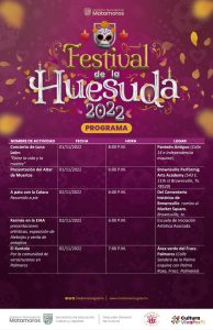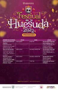 Larisa López Carrillo, directora General de Cultura explicó que este año, la Ciudad de Brownsville, y el Consulado de México en Brownsville, Texas se suman a las actividades del Festival de la Huesuda 2022, las cuales se realizarán a partir del 28 de octubre y hasta el 5 de Noviembre.La celebración del “Día de Muertos” es una fiesta llena de color, recuerdos, comida, dulces y antiguas tradiciones; su verdadero significado para los mexicanos, es profundo y abarca la cultura, la tradición, la comunidad y la celebración, mencionó la funcionaria municipal.