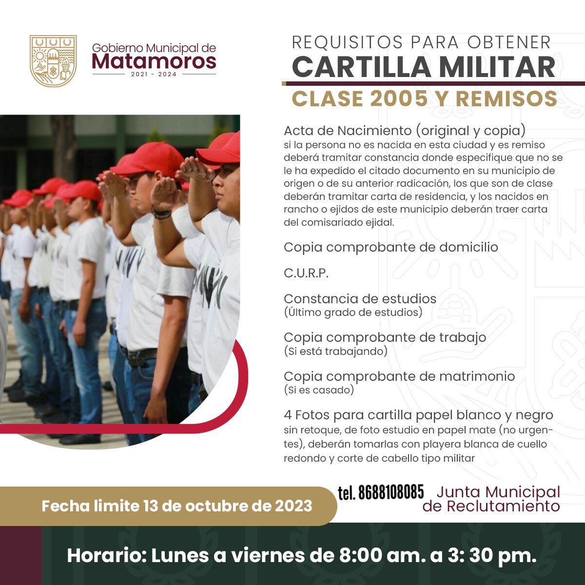 El Gobierno de Matamoros a través de la Junta Municipal de Reclutamiento informa a todos los jóvenes de la Clase 2005 y Remisos que el próximo 13 de octubre vence la fecha para realizar el trámite para obtener su carrilla militar.