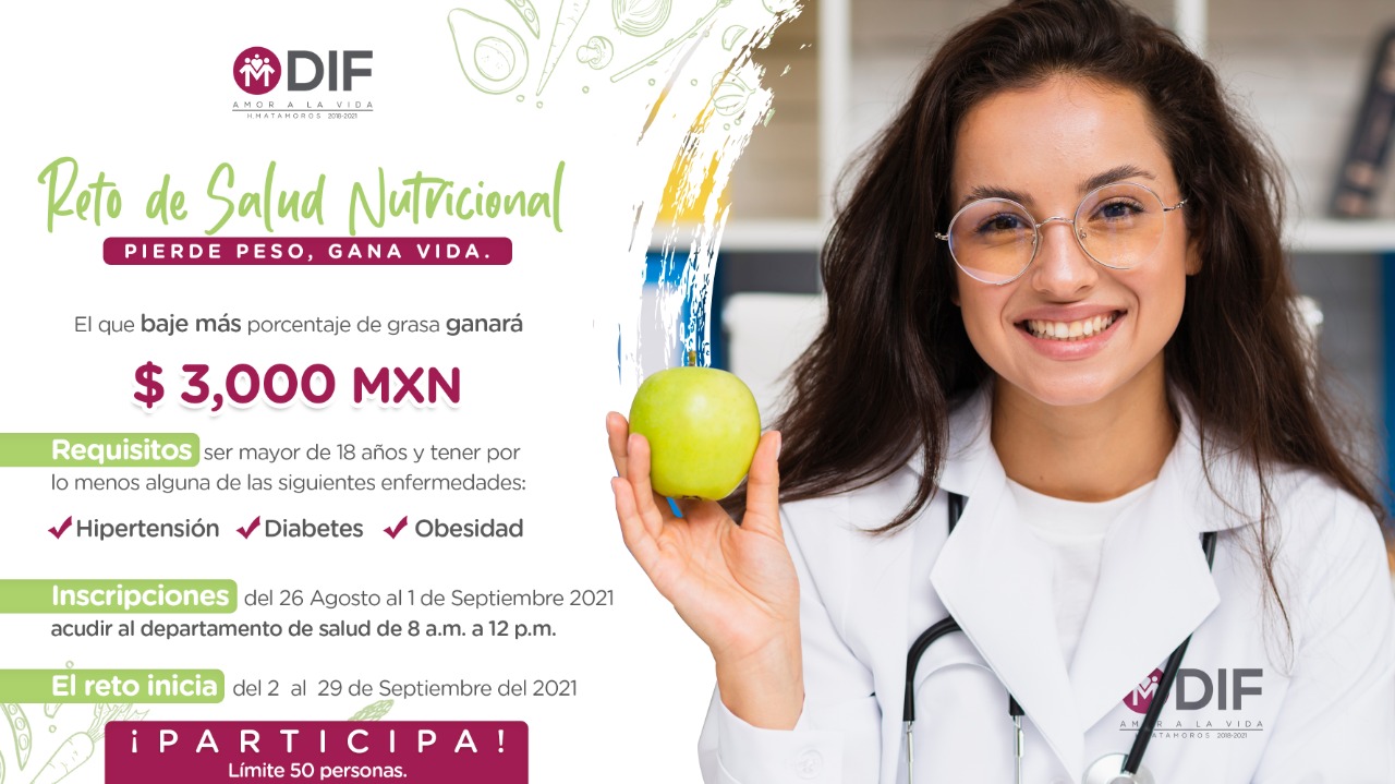 Con la finalidad de brindar a la población un estilo de vida saludable y mejorar el control de enfermedades, el Sistema DIF Matamoros encabezado por la C.P. Marsella Huerta de López, invita a la población a participar en el reto nutricional para personas que padecen Hipertensión, Diabetes u Obesidad.