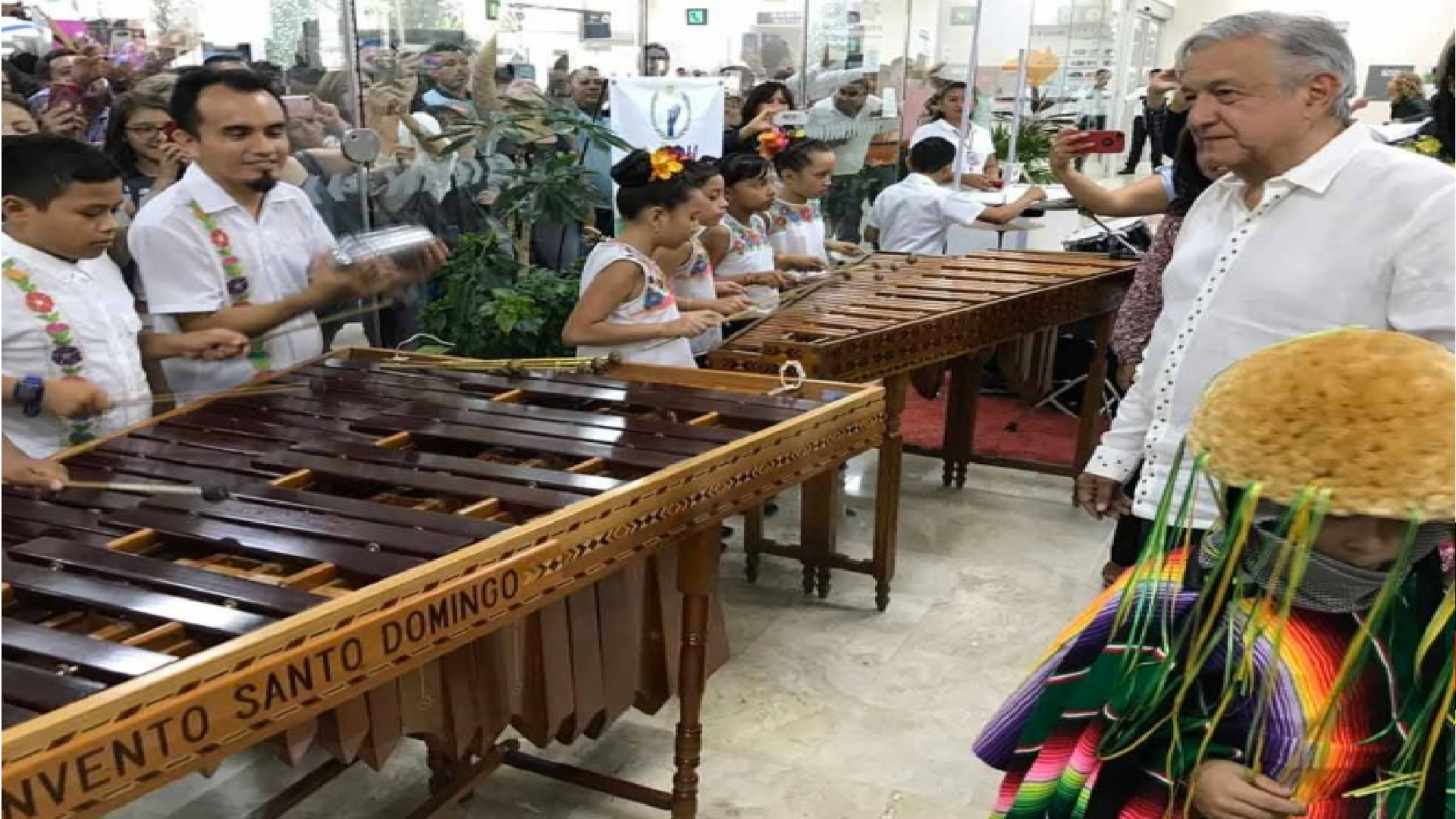 A su arribó al Aeropuerto Internacional de Tuxtla Gutiérrez, López Obrador fue recibido por un grupo infantil de marimba.