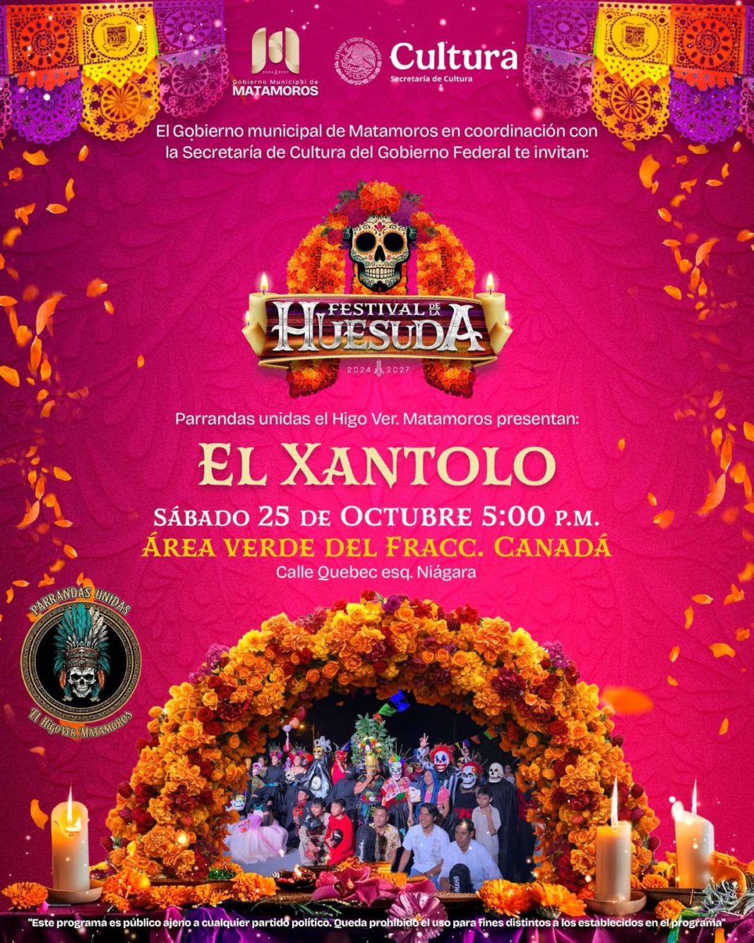 El evento se llevará a cabo este sábado 25 de octubre en el Área Verde del Fraccionamiento Canadá, donde las familias podrán vivir una tarde especial en compañía de amigos y seres queridos. Como parte del programa, se contará con la presentación estelar de Parrandas Unidas El Higo, Ver. – Matamoros, un grupo reconocido por mantener viva la alegría y el espíritu festivo de esta tradición ancestral.