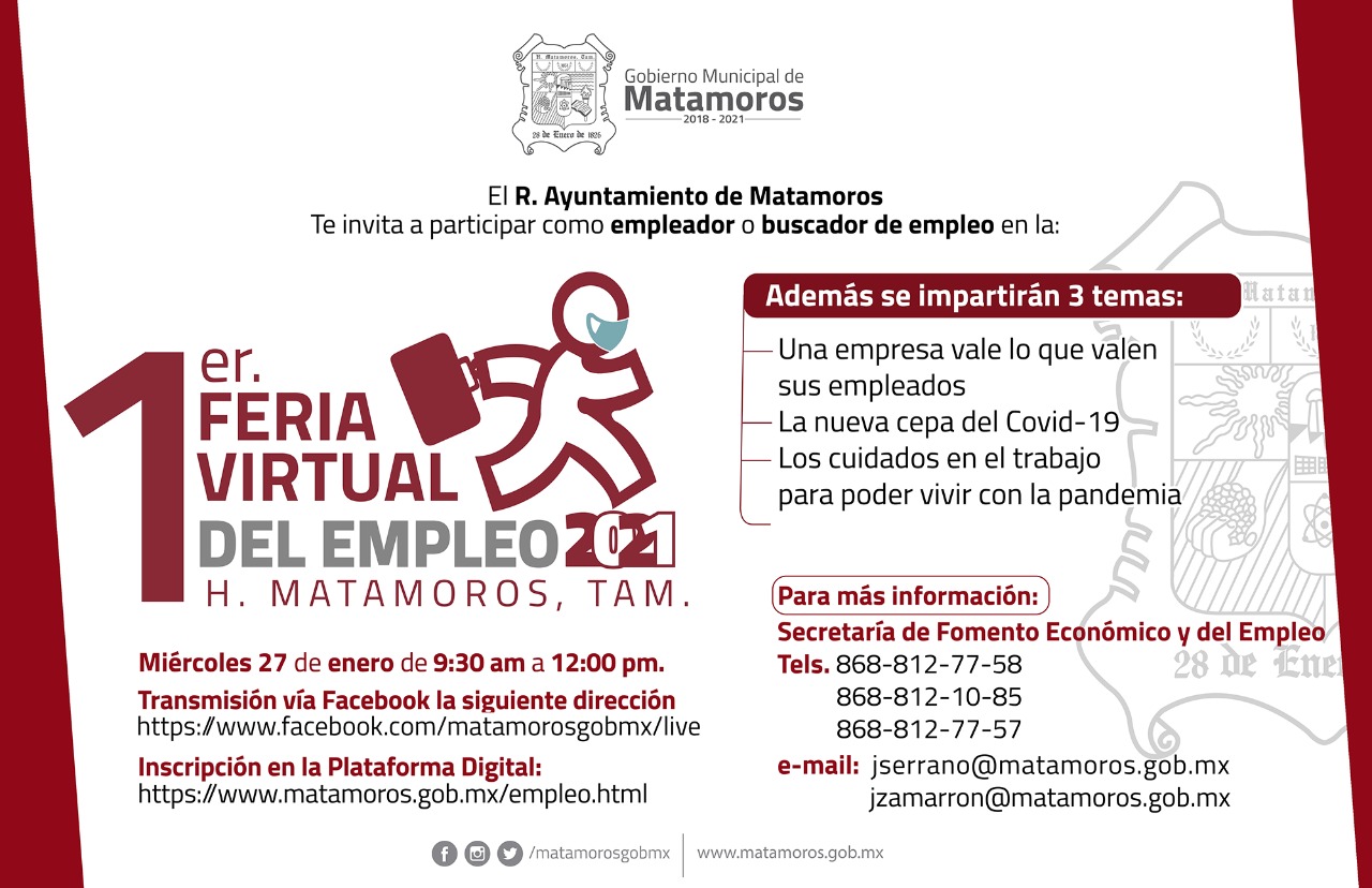El Gobierno Municipal de Matamoros a través de la Secretaría de Fomento Económico y del Empleo invita los empresarios y a los buscadores de un espacio laboral, a participar en la Primera Feria Virtual del Empleo 2021.