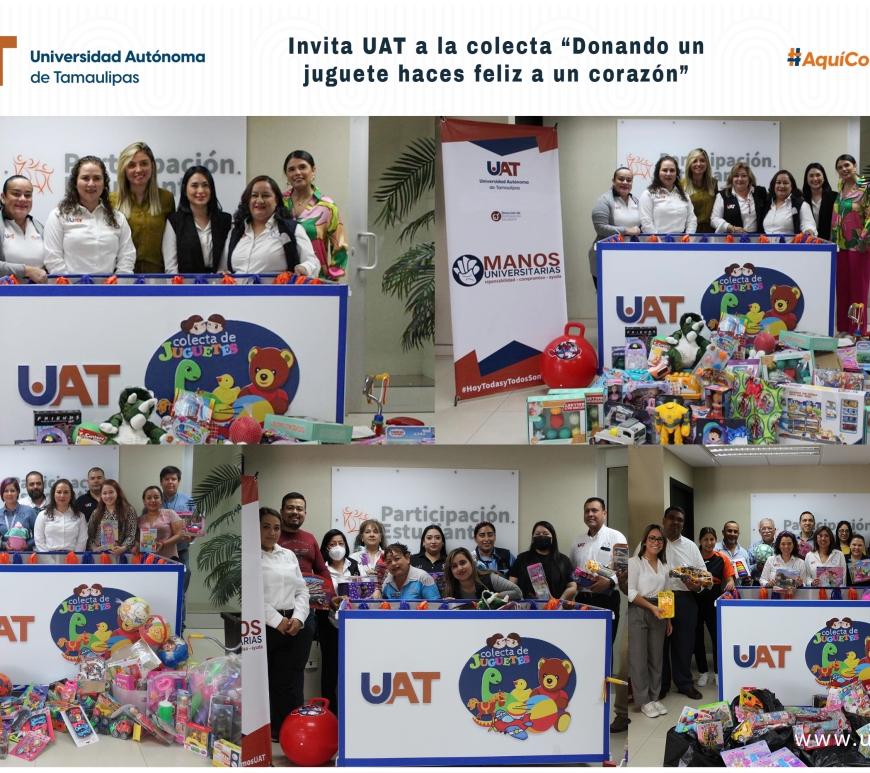 La Universidad Autónoma de Tamaulipas (UAT) fomenta la participación de su comunidad estudiantil, docente y administrativa en la colecta 2023 “Donando un juguete haces feliz a un corazón”, cuyo objetivo es recabar la mayor cantidad posible de juguetes en beneficio de la niñez tamaulipeca.