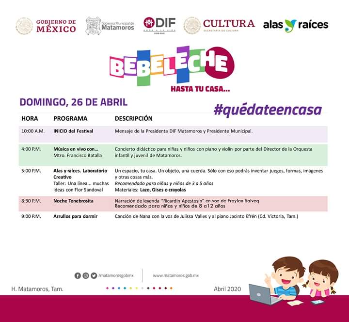El Gobierno Municipal de Matamoros, el Sistema para el Desarrollo Integral de la Familia y la Secretaría de Cultura del Gobierno Federal a través del programa “Alas y Raíces” invitan a todas las niñas y niños a participar en el 2º. Festival BEBELECHE Hasta tu Casa que se realizará del 26 al 30 de abril vía internet.