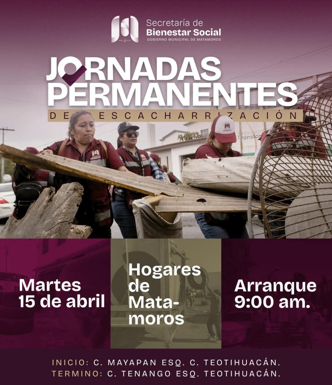 Con el objetivo de fomentar entornos más saludables y mejorar la calidad de vida de las y los matamorenses, el alcalde Beto Granados anunció la continuidad, este martes, de la jornada permanente de limpieza en la colonia Hogares de Matamoros, en coordinación con la Secretaría de Bienestar Social.