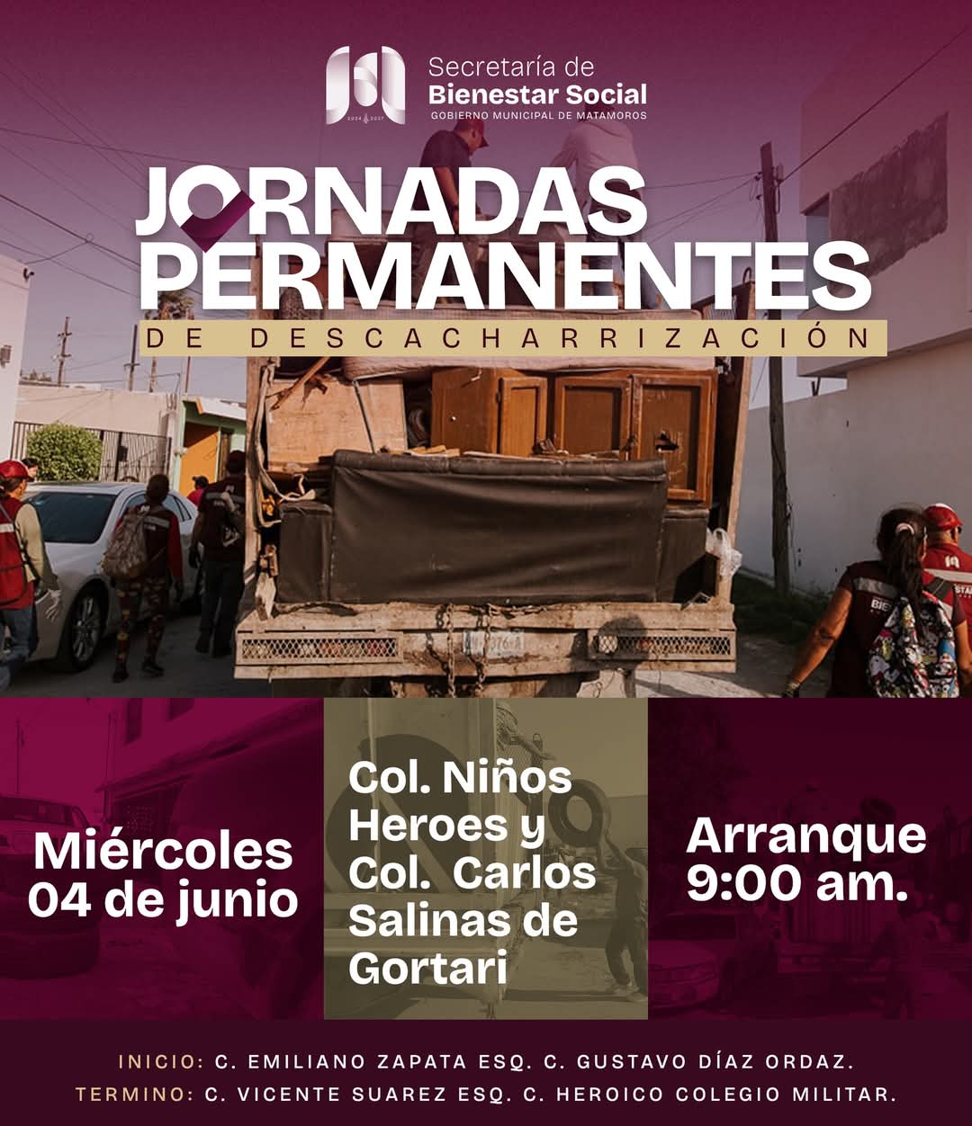 La salud y el bienestar de nuestras comunidades es una prioridad, por ello, este miércoles 4 de junio, a partir de las 9:00 de la mañana, las Jornadas permanentes de descacharrización estarán presentes en las colonias Niños Héroes y Carlos Salinas de Gortari.