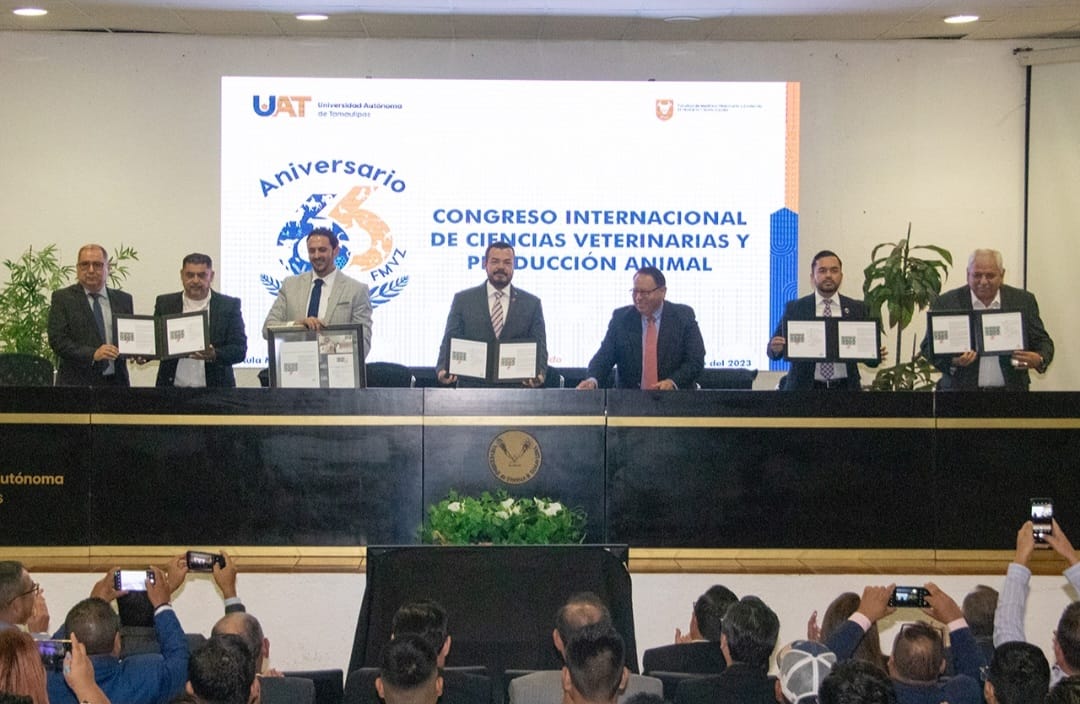 El C.P. Guillermo Mendoza Cavazos, rector de la Universidad Autónoma de Tamaulipas (UAT), presidió la ceremonia conmemorativa del 66 Aniversario de la Facultad de Medicina Veterinaria y Zootecnia (FMVZ-UAT) “Dr. Norberto Treviño Zapata”, en cuyo marco inauguró el Primer Congreso Internacional de Ciencias Veterinarias y Producción Animal.