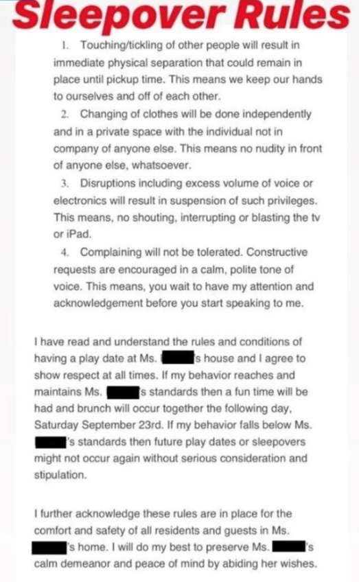 Entre las normas, los niños tienen prohibido “hacerse cosquillas o desvestirse uno frente al otro”, tampoco se les permite “gritar o quejarse”. Después de que este ‘contrato’ fuese compartido en Reddit, los usuarios compartieron rápidamente su indignación y calificaron las estrictas reglas de “locura”.