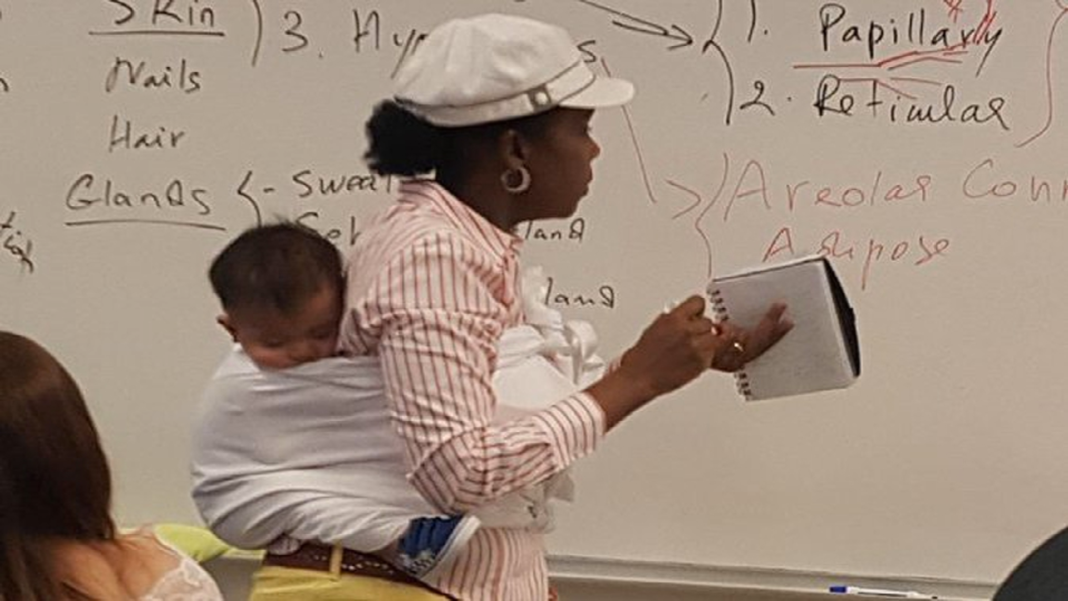 Su estudiante no pudo encontrar una niñera hoy y siendo la verdadera madre africana que es, enseñó una clase de TRES horas con el bebé en la espalda y lo alimentó.