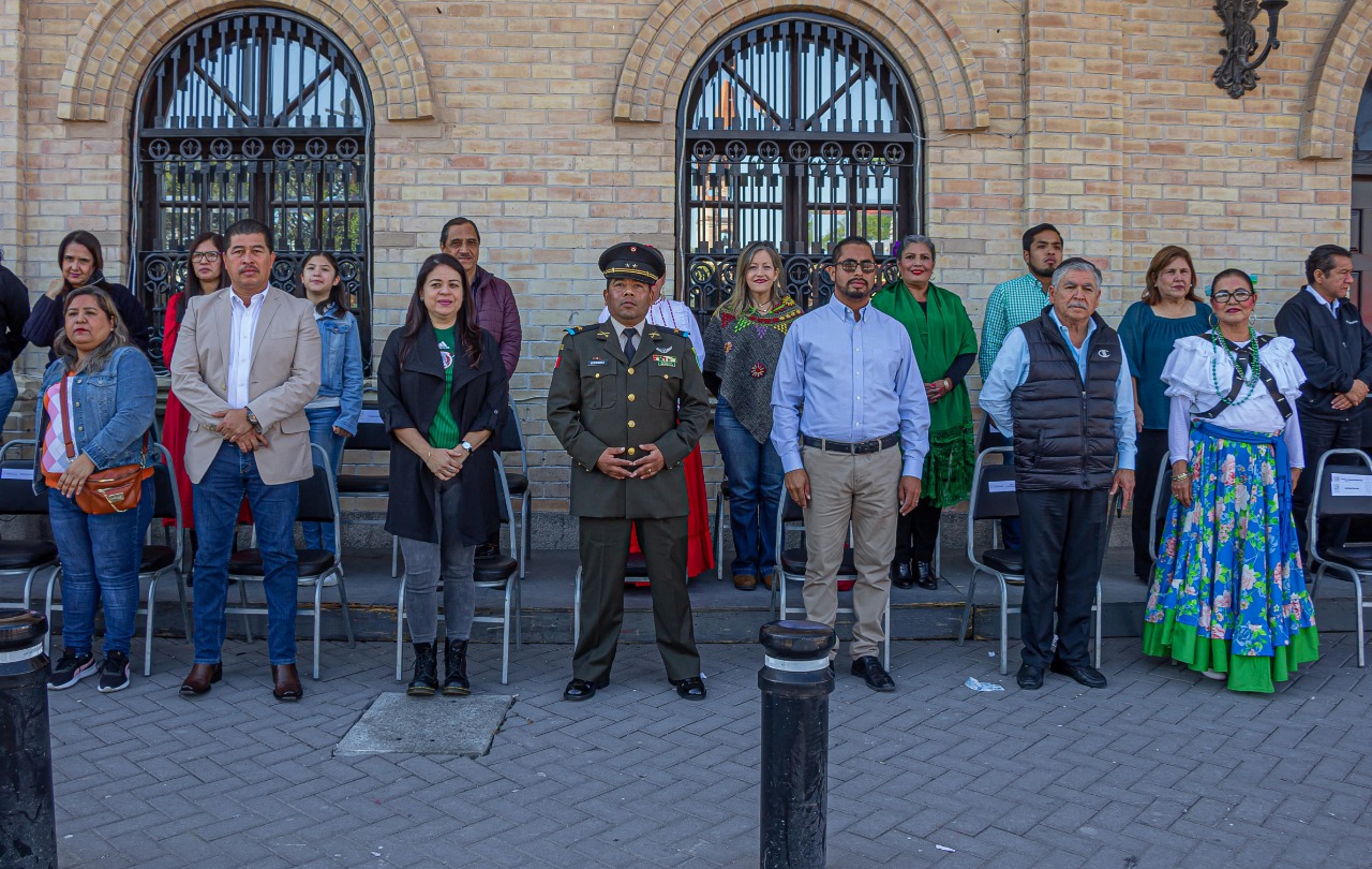 Desde un estrado instalado en el exterior de la Presidencia Municipal, el Presidente Municipal Interino, Alejandro Cerezo Ruiz, acompañado por autoridades militares, educativas y funcionarios municipales, presenció el vistoso desfile.