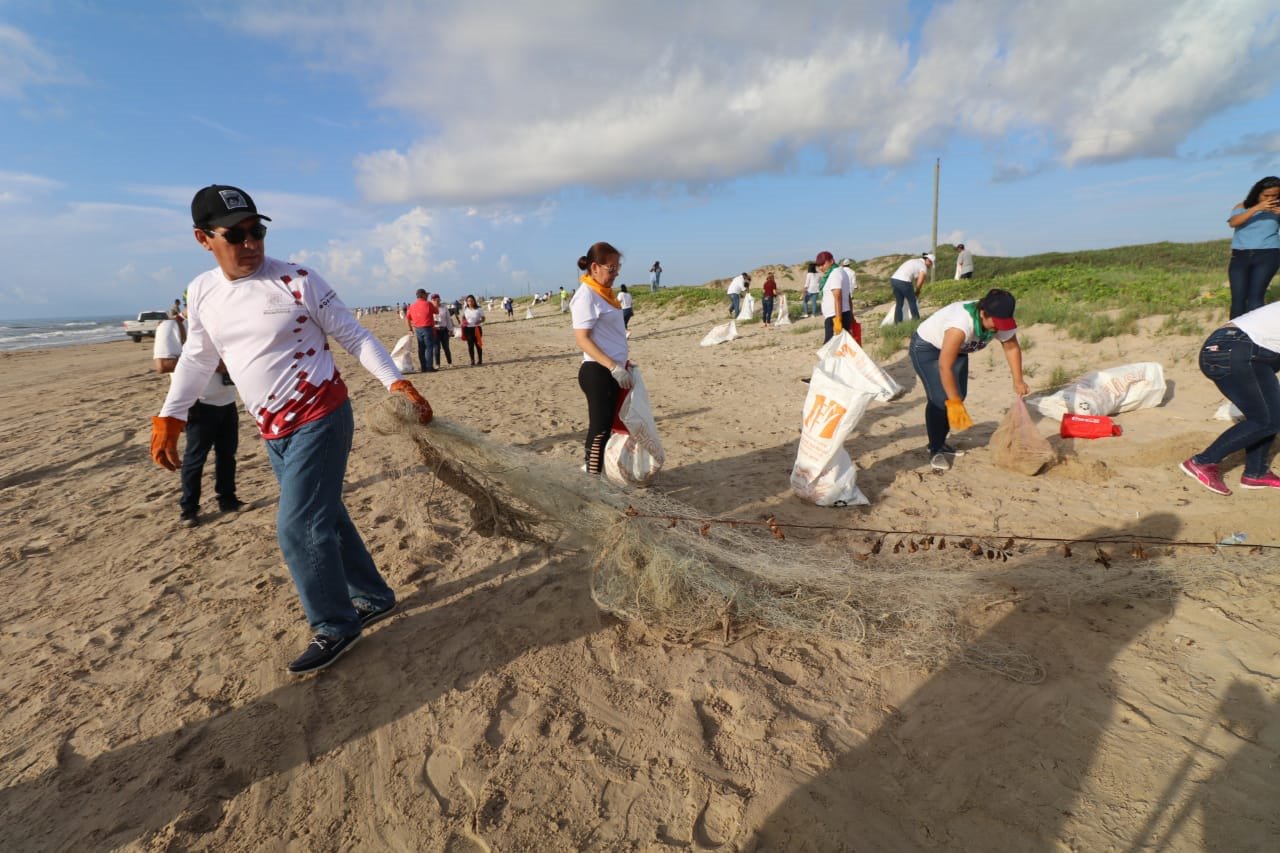 Más de 400 voluntarios de empresas, tiendas de autoservicio, sociedad civil y del propio Ayuntamiento se sumaron a la jornada por la limpieza de la Playa Bagdad que encabezaron el alcalde Mario Alberto López Hernández y su esposa Marsella Huerta de López.