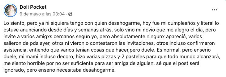 Lo siento, pero ya ni siquiera tengo con quien desahogarme, hoy fue mi cumpleaños y literal lo estuve anunciando desde días y semanas atrás, solo vino mi novio que me alegró el día, pero invité varios amigos cercanos según yo, pero absolutamente ninguno apareció“, escribió Doli.