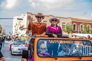 Antes de iniciar el desfile en Matamoros, el alcalde Mario López Hernández, su esposa Marsella Huerta de López y los invitados especiales de las Fiestas Mexicanas participaron en el desfile internacional que se realizó en Brownsville, Texas organizado por las Fiestas del Charro.