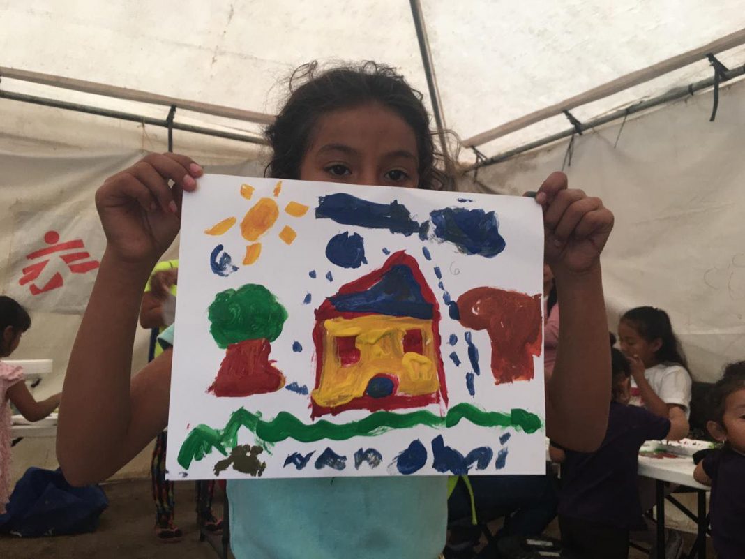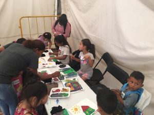 Como parte del desarrollo de las actividades infantiles en el campamento del bordo del Río Bravo, voluntarios imparten clases de pintura a niños migrantes desde los cuatro años hasta los doce, en un espacio del campamento de migrantes.
