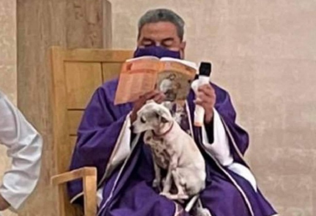 En redes sociales circula una fotografía del sacerdote Gerardo Zatarain, párroco de la iglesia Todos los Santos de la ciudad de Torreón, al noreste de México, ofreciendo misa con su perrita en el regazo, ya que esta se encontraba “estresada” y no quería quedarse sola.