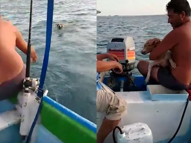 Los hombres iban en su lancha cuando vieron a lo lejos a un perrito que nadaba sin rumbo, muy lejos de la orilla y que necesitaba ayuda