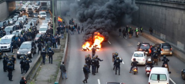 Los hechos más graves sucedieron en la Porte Maillot, en donde centenares de taxistas quemaron neumáticos y bloquearon varios carriles del periférico de la capital francesa.
