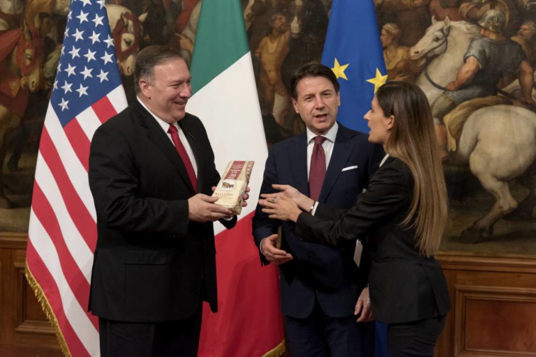 En el primer día de su visita oficial a Italia, el secretario de Estado de Estados Unidos, Mike Pompeo, recibió una cálida bienvenida… y un trozo de queso.