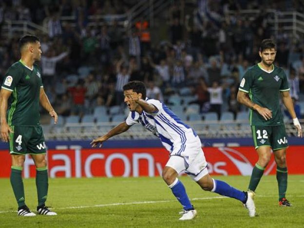 Illarramendi y Zurutuza conducían el juego local y arriba, en cada acercamiento blanquiazul, Willian José o el propio Vela complicaban la vida a los defensas verdiblancos. Willian José tuvo una gran oportunidad para desnivelar el marcador con un remate de cabeza detenido por Adán.