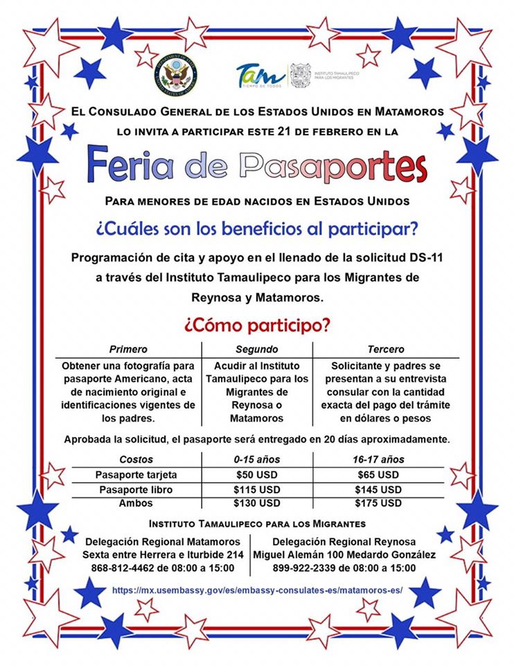 La Feria de los Pasaportes esta programada para realizar el próximo 21 de febrero en el Consulado General de Estados Unidos en Matamoros y esta dirigida a los padres interesados a reunir los requisitos y obtener el beneficio para sus hijos.