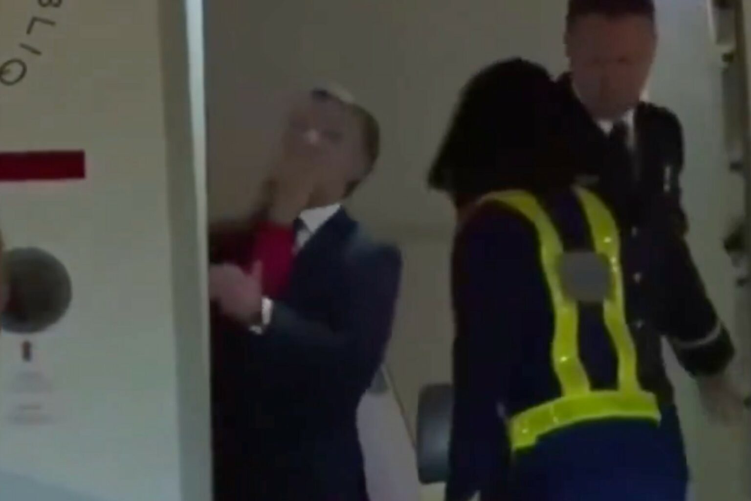 Emmanuel Macron da un cuarto de giro por el empujón de la mano de su mujer, se da cuenta entonces de que la puerta está abierta y de que lo que ha ocurrido se ha visto desde el exterior de la aeronave y lanza un saludo con una sonrisa.