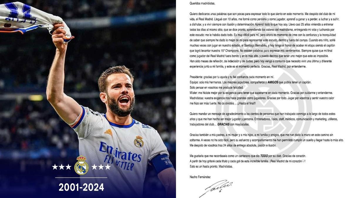 Dicen que Dios hizo el mundo, pero que el Real Madrid creó a las estrellas; y un claro ejemplo de esta frase fantástica sacada de un cuento, es Don Nacho Fernández, quien cumplió el sueño de todo niño, jugar para los Merengues desde que tenía 10 años, pero este martes 25 de junio y luego de ser el capitán del equipo, el canterano hace oficial su salida de la Casa Blanca con un emotivo comunicado.