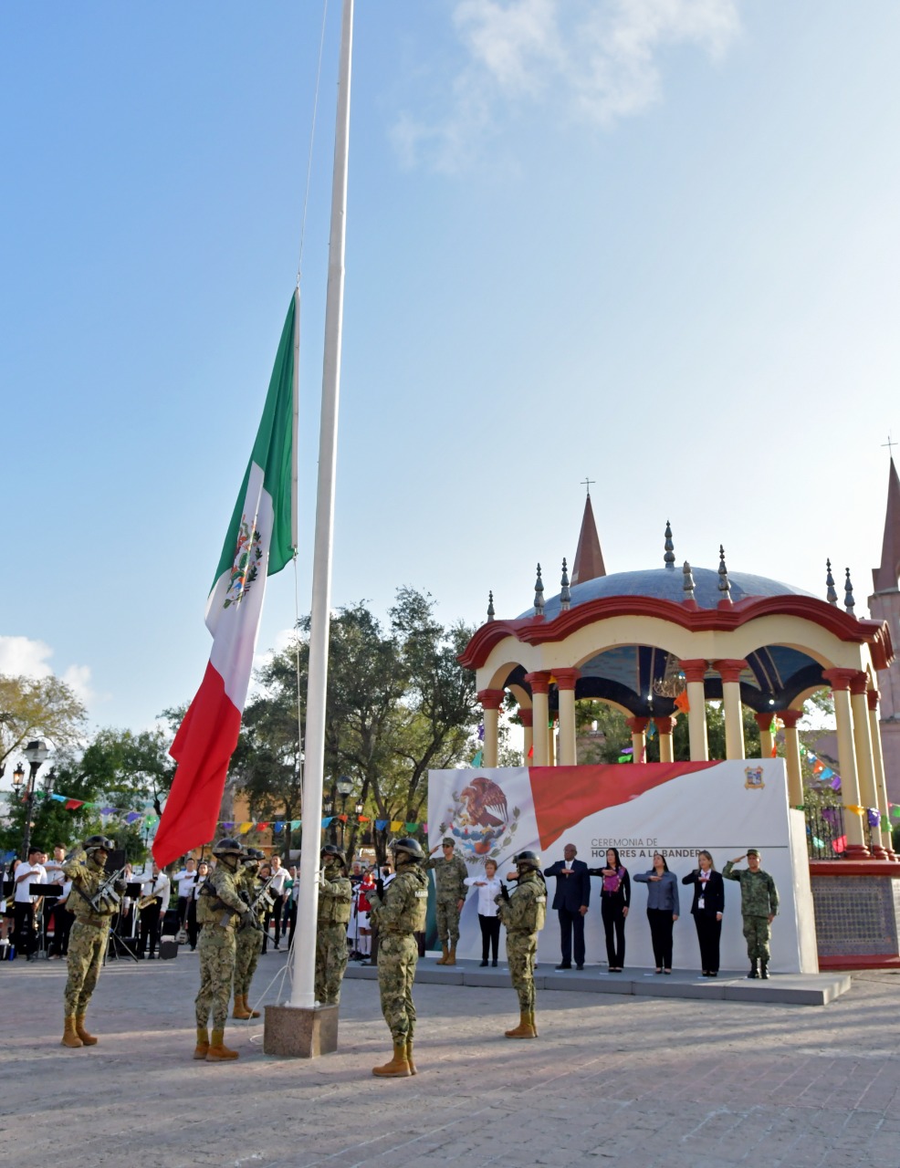 En la ceremonia se realizó el izamiento de bandera por elementos de la Primera Zona Naval, bajo los acordes de la Banda de Guerra de la Escuela Secundaria Técnica #51 “Jaime Torres Bodet”. Posteriormente se interpretó el Himno Nacional Mexicano en voz del C. Ricardo Castañeda Treviño acompañado de la Banda de Música Municipal. El juramento a la bandera estuvo a cargo de Ana Sofía Salazar Guerra, alumna del 2do grado de preescolar del Centro Asistencial de Desarrollo Infantil CADI “Profa y Lic. Margarita García Sparks”.