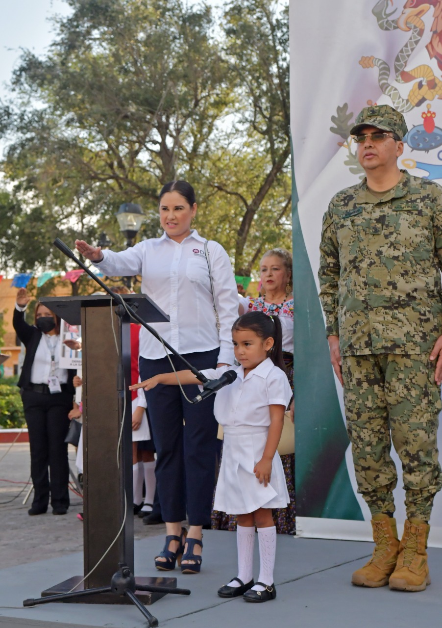 Esta mañana el Sistema DIF Matamoros que preside la C.P. Marsella Huerta Sosa de López estuvo a cargo de la Ceremonia de Honores a la Bandera que se realiza el primer lunes del mes en la Plaza Principal Miguel Hidalgo.