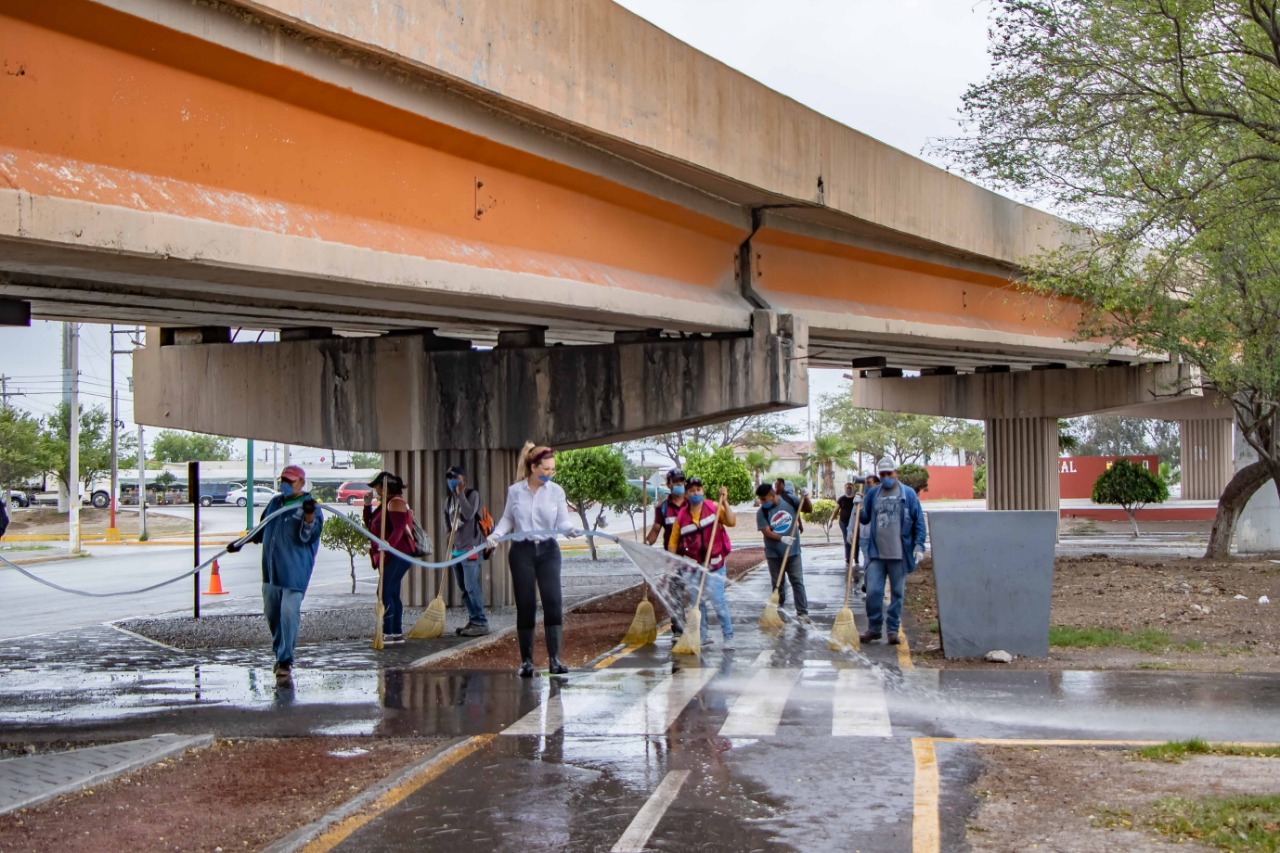 El Gobierno Municipal de Matamoros a través de la dirección de Espacios Públicos a cargo de Myria Leal Guajardo realiza intenso trabajo de sanitización, como medida para contener el coronavirus.