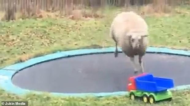 Imágenes divertidas muestran a la oveja rebotando repetidamente en el trampolín del jardín de una familia.