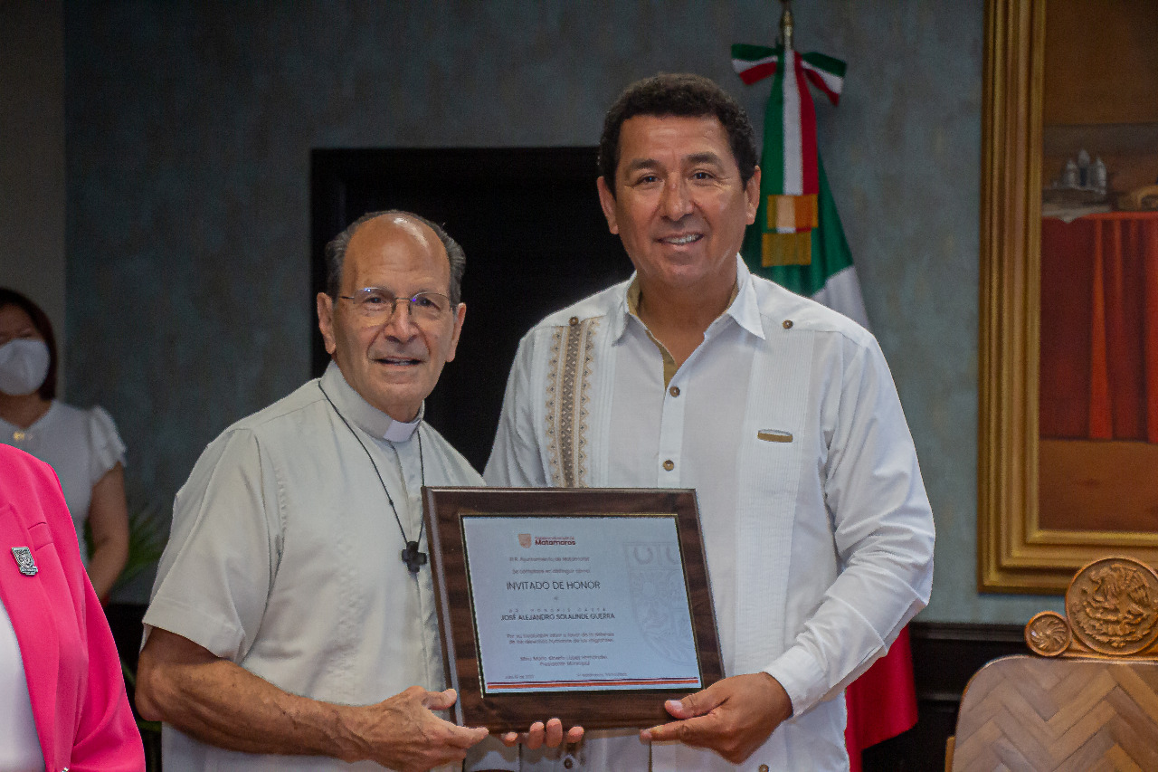 El alcalde Mario Alberto López Hernández acompañado por integrantes del Republicano Ayuntamiento recibió en la Presidencia Municipal de Matamoros al Dr. Honoris Causa, José Alejandro Solalinde Guerra, a quien le reconoció su labor y lucha como defensor de los derechos humanos de los migrantes.